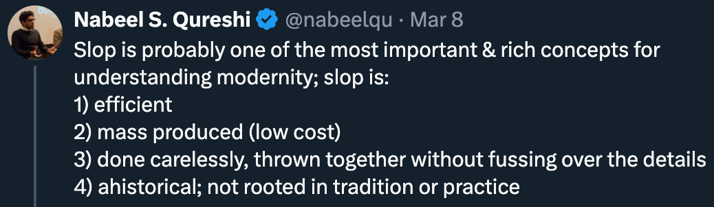 The web democratised access to information; now AI has democratised access to content generation. This platform shift in technology has given us incredible tools to write, create film, compose music, and generate images. We are empowered beyond belief to create, build, and share our work. But it’s also enabled ‘slop’- the synthetic slurry of mass-produced, low-context content - to infiltrate our collective mindshare.